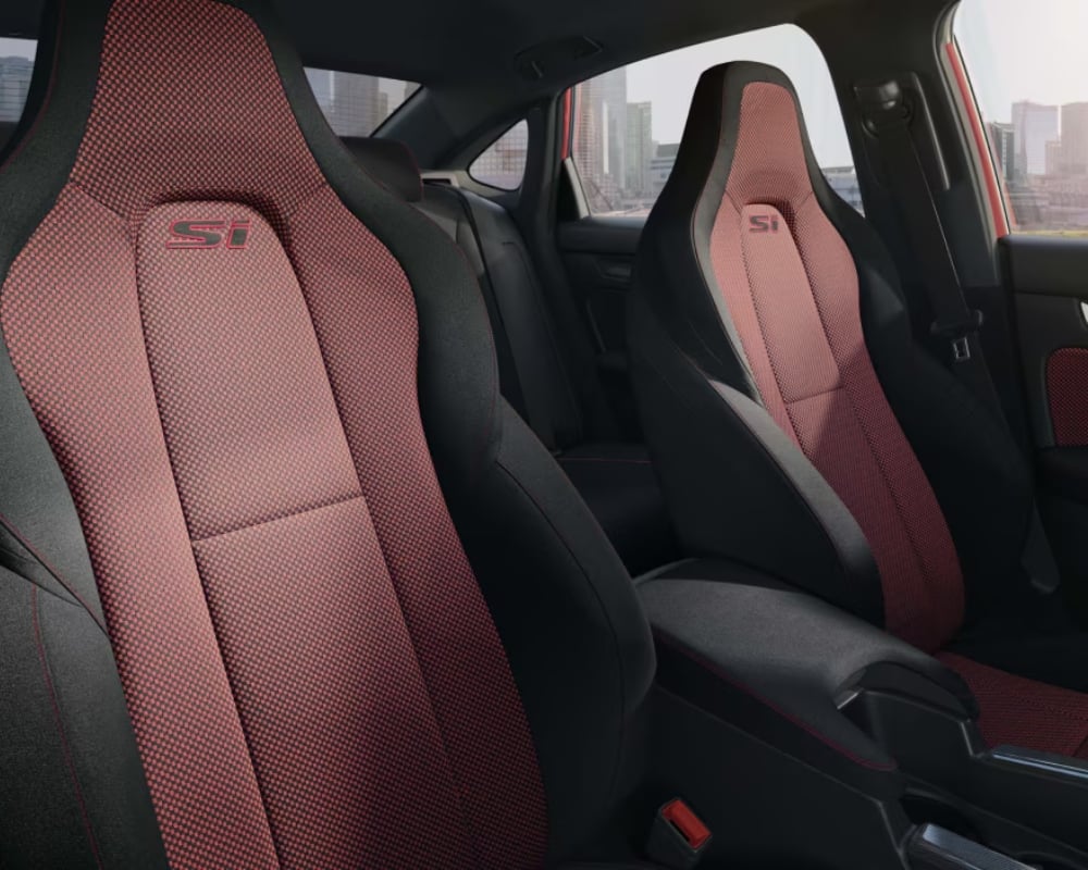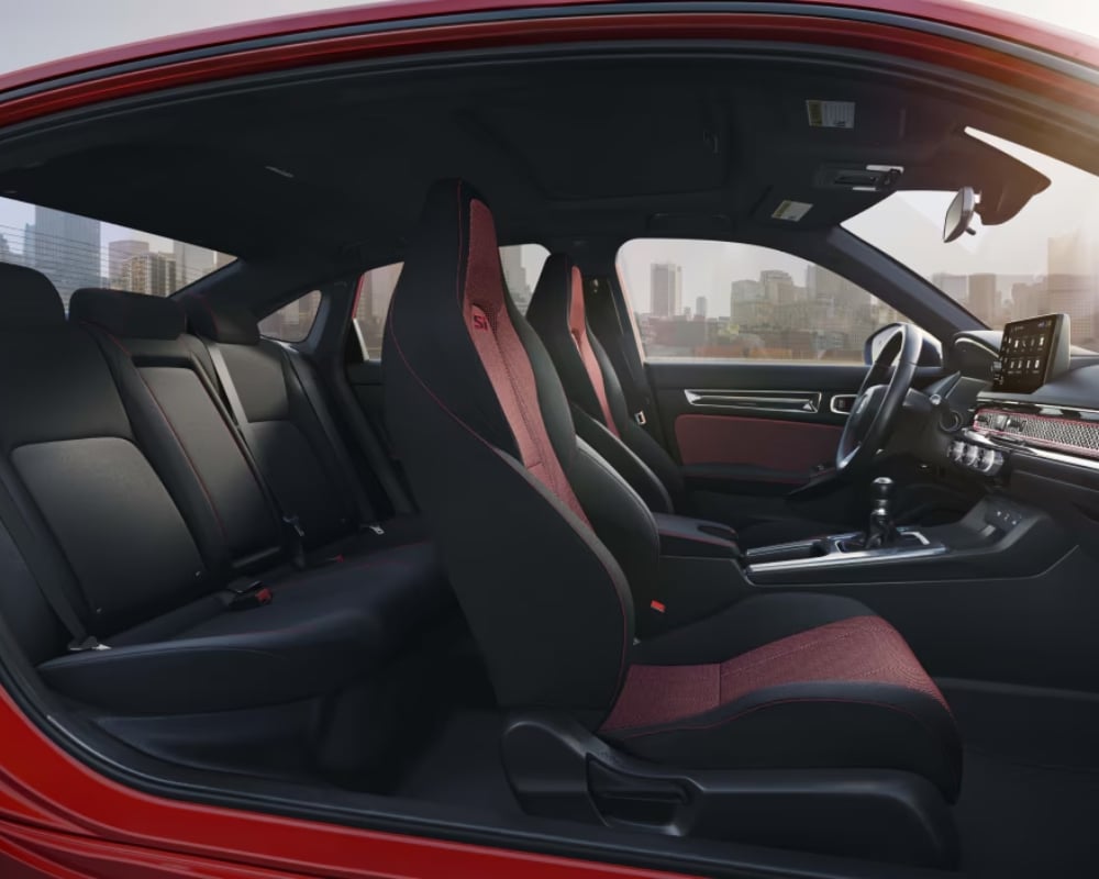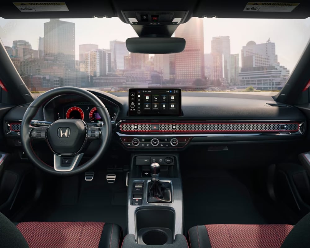 Step inside the 2025 Honda Civic Si, and you'll find a cabin that’s equally focused on performance and comfort. The sport seats with red stitching provide ample support during spirited drives, while the leather-wrapped steering wheel offers a premium touch. A 9-inch touchscreen infotainment system features Apple CarPlay® and Android Auto™, allowing you to stay connected while on the go. The digital display provides easy access to important driving information, and with Honda Sensing® Safety Suite included, you can drive confidently knowing that features like Forward Collision Warning and Lane Keeping Assist have your back.
